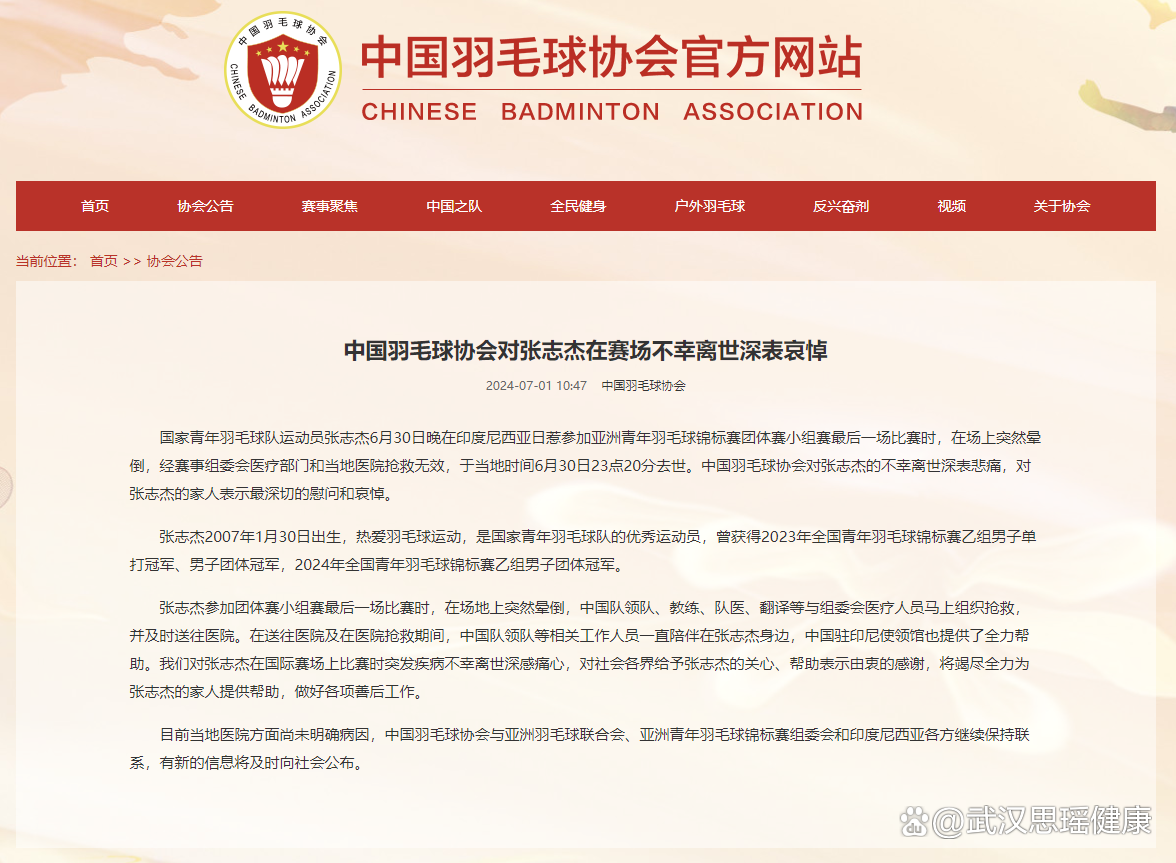 凭证亚洲羽毛球协会和印度尼西亚羽毛球协会的外地时间7月1日的声明,中国单打运发动张志杰在昨晚的角逐中在球场突然晕倒,被送往医院,于外地时间昨日23时20分去世。